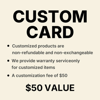 This Custom Design Fee Card represents an additional $50 customization charge applied to your order. It is used to cover the cost of personalized design, materials, or custom production services requested by the customer.