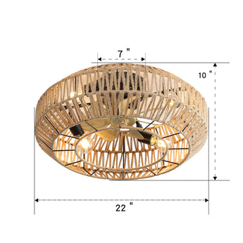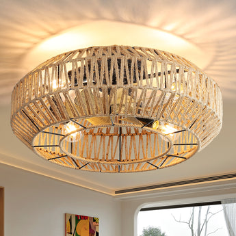 Add handcrafted rustic charm to your space with the DICI MALL 22-inch woven rope ceiling fan. Featuring a lantern-style, hand-wrapped natural jute rope drum shade, this flush mount fan is ideal for low ceilings and compact rooms. The open-weave cage design softly diffuses light from four included E26 G45 bulbs, creating warm ambient illumination.